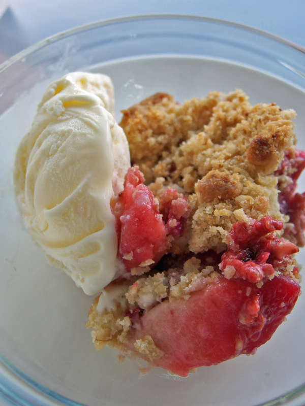 今回は酸っぱさを和らげるために林檎をプラスして、上にかけるクランブルを増やし、そしてアイスクリームを添えました。