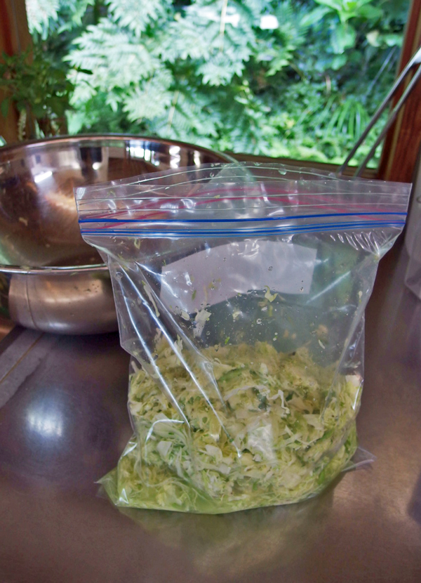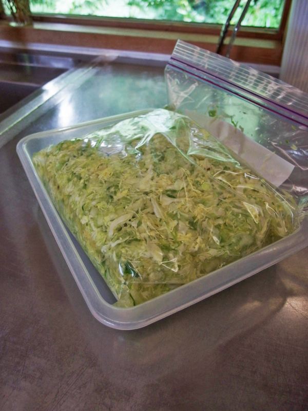 キャベツがしんなりして扱いやすくなったら、ジップロックに入れます。