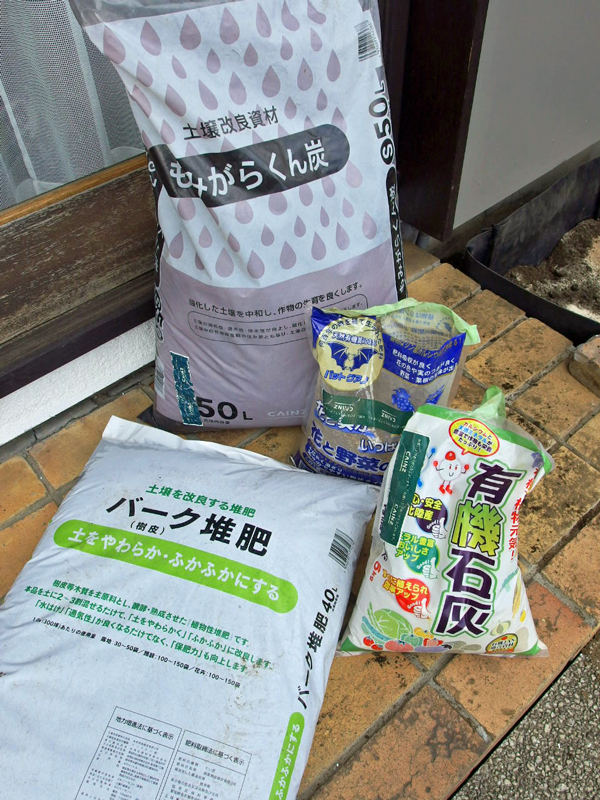 入れたのはバーク堆肥、もみ殻燻炭、有機石灰、バットグアノ、