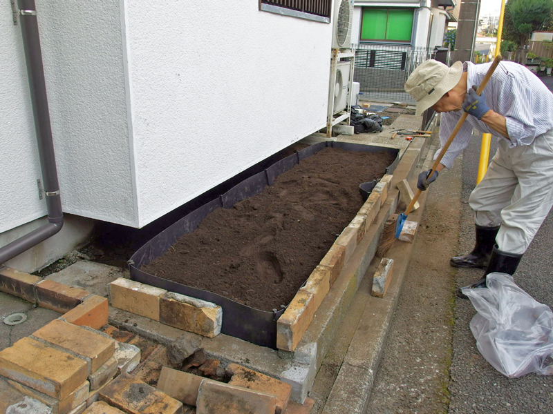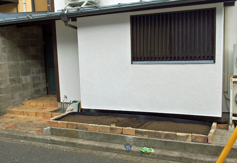 テラスの一部を撤去して出た煉瓦を、工務店さんがとって置いて下さったので、その煉瓦で土の上に見えていた「あぜガード」を囲ってみました。