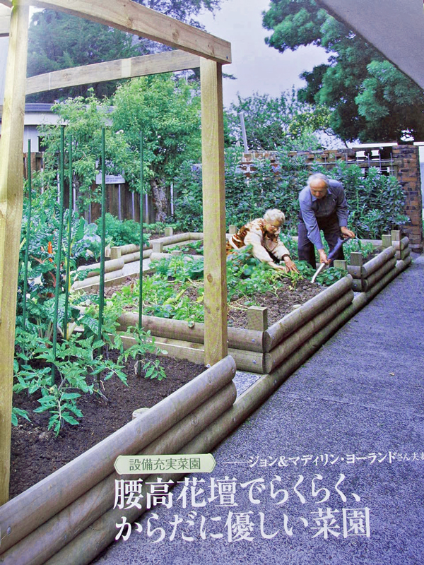 8年前の「菜園ガーデニング」という本にあった、この写真。長年趣味で野菜作りをしてきたご夫妻が、歳をとってかがむ姿勢がきつくなって作った「腰高花壇」の野菜畑です。最近は「ライズド・ベッド」と呼ばれて、作業が楽なので人気が出ている畑のスタイルです。