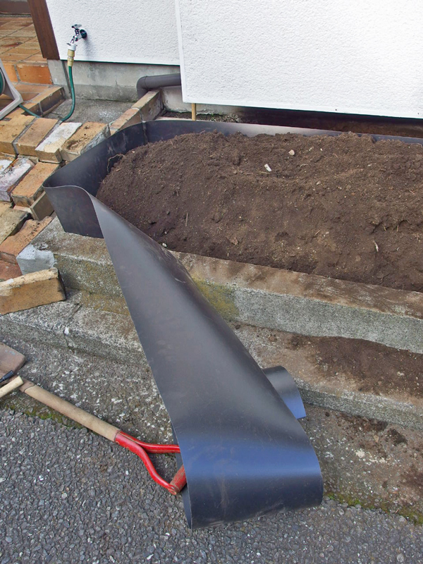 巻いて販売されていて、丸まるクセがついているので、廊下に広げて椅子で押さえて何日か置いて平らにし、必要な長さをカッターで切り、畑の淵に沿って地中に立てました。