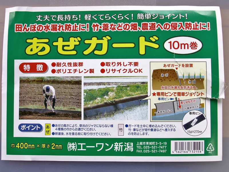 「あぜガード」といって、水田の水漏れ防止や竹の根が畑に入ってくるのを防ぐものです。用途によって巾が色々あるのですが、試してみないと分らないので、とりあえず巾30センチと40センチを10メートルづつ買ってみました。