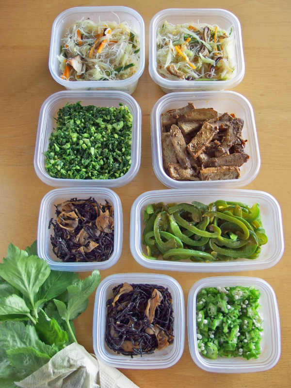 牛蒡と厚揚げの味噌煮、ヒジキ蓮根は、健康重視のマクロビオティックのオカズ。大根の葉、パプリカ、オクラ、三つ葉は自家菜園の野菜。そして五目ビーフンは残り物料理です。