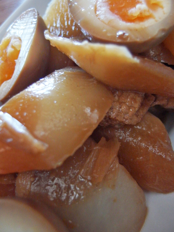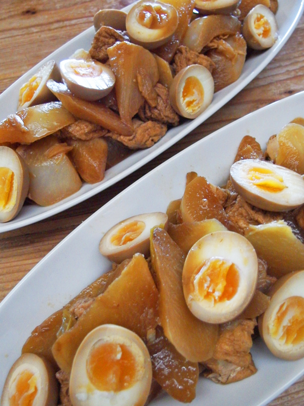 豚バラ肉の代わりに厚揚げを使い、厚揚げと大根だけでは主菜として華やぎがないので、醤油につけておいた茹で卵を半分に切ってのせてみました。