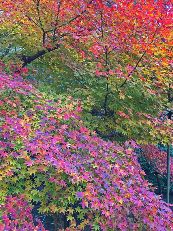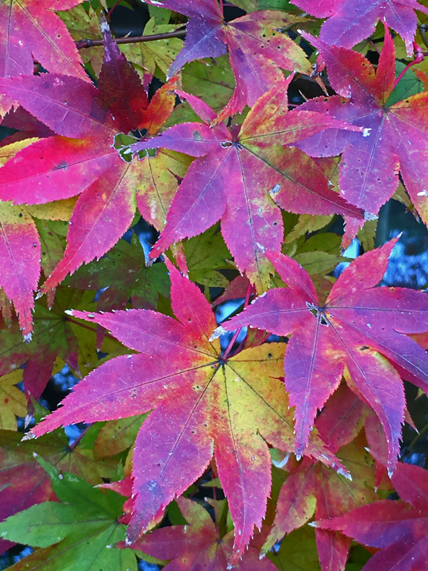すると、アイフォーンのファインダーに写る紅葉が、青やピンクに輝きだしました。