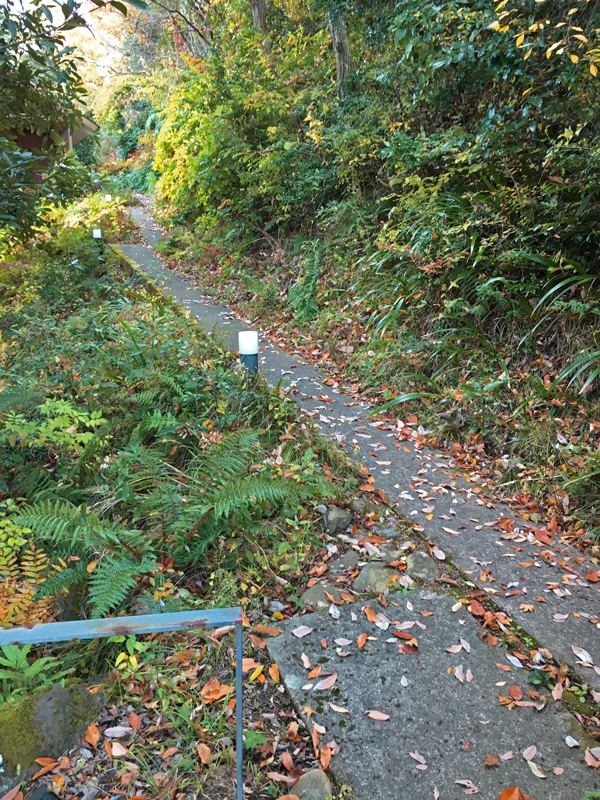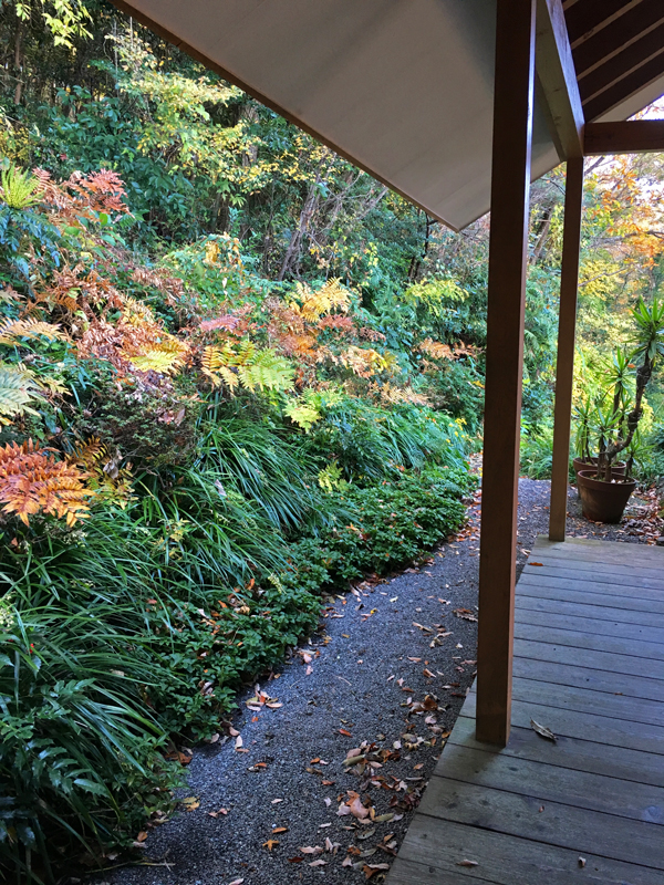 玄関前の常緑のランやフッキソウの緑に引き立てられた、紅葉したゼンマイの大きな葉。