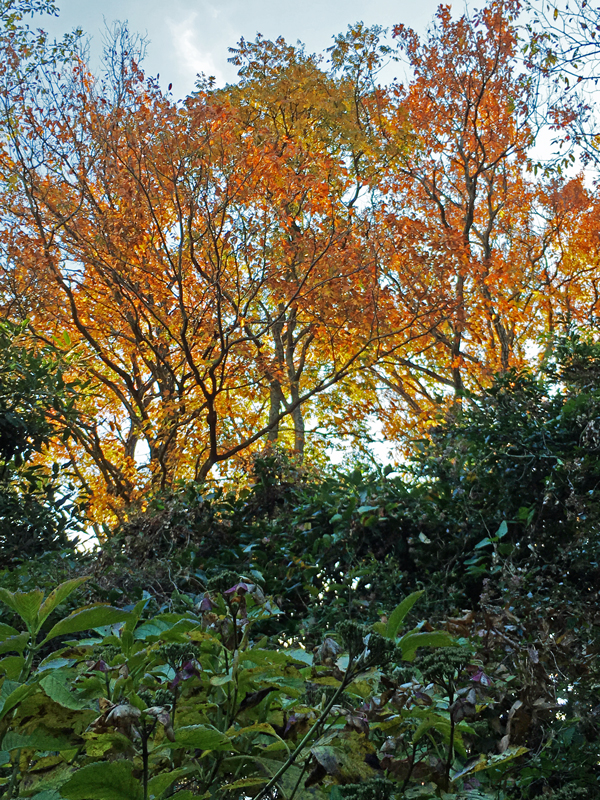 玄関を出て山側を見上げると、紅葉したコナラのがが逆光を浴びて輝いています。
