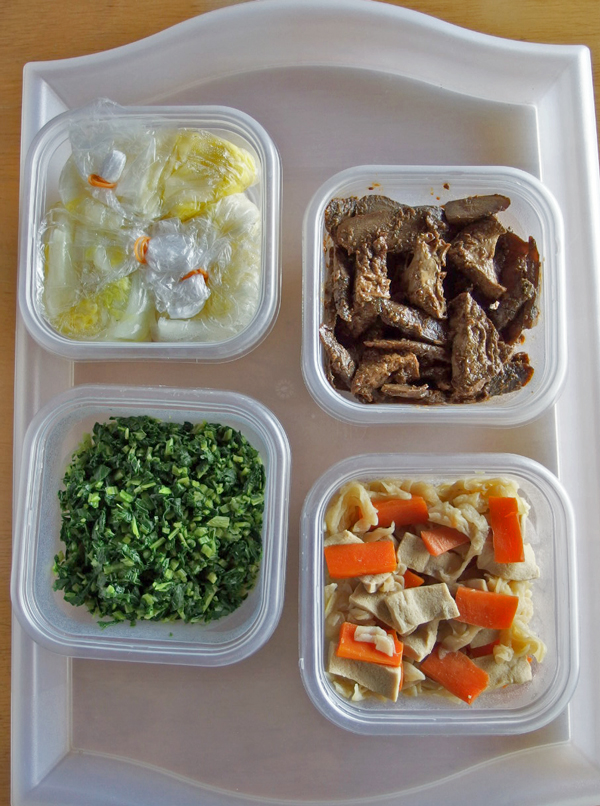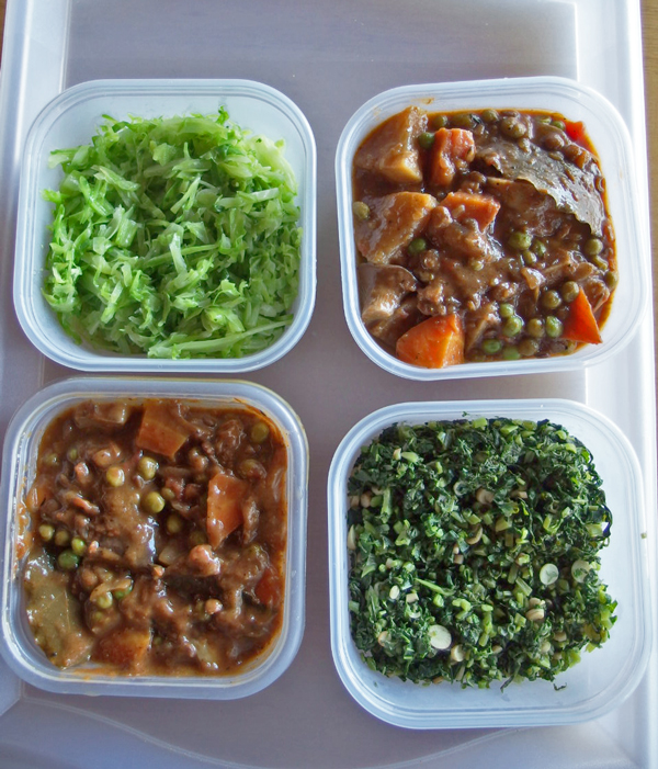 写真では入れ物の大きさが分りませんが、カップ3杯以上650cc入りの容器です。シチューは容器1つが1~2食分、大根の葉は1本分以上あるので1週間分はあります。