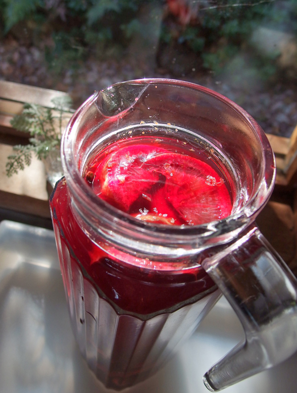 赤ワイン1本に、伊豆のみかんの絞汁200cc、レモン汁1個分、みかんとレモンは先にピーラーで表皮を剥いてピッチャーに入れておきます。大きなスダチがあったのでそれも1個、皮ごと輪切りにしてピッチャーに入れました。クローブ3~5個、それにコアントローを100cc、全部ピッチャーに入れて一晩冷蔵庫で香りを出します。
