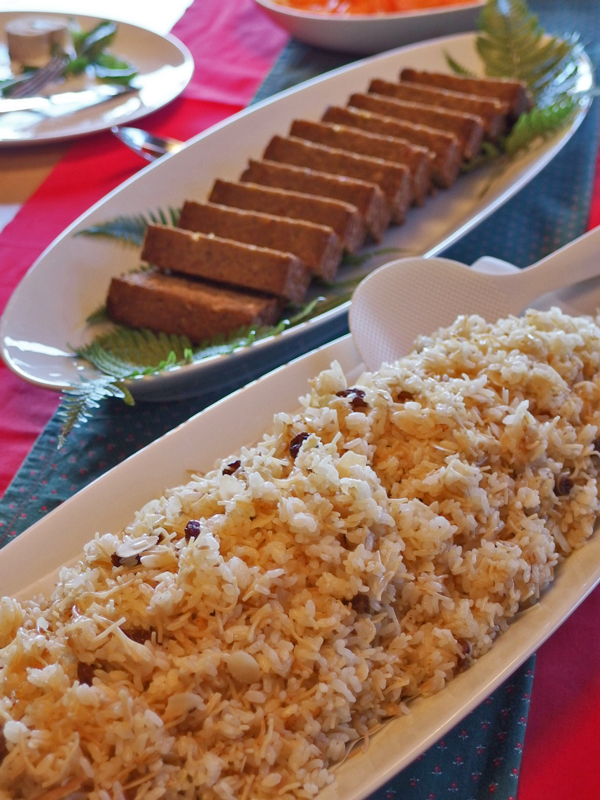 このベジローフには、バミセリ、アーモンド、レーズンを入れて炊いた中近東風ご飯を添えて頂きます。