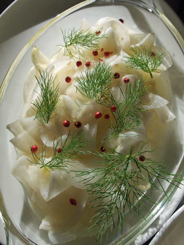 菜園のフェンネルの葉とピンクペッパーを散らすと、クリスマスです。