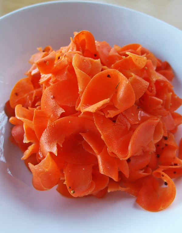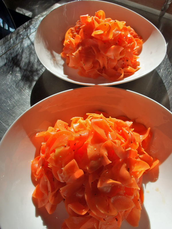 人参を千切りにするより楽な気がして、かつら剥き器でリボン状に切ってみました。