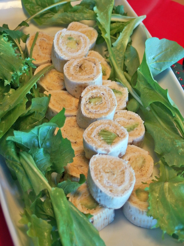 中東料理のヒヨコ豆のペースト「Hummus」をフラットブレッドに塗って巻いた ロールサンドイッチ 中にアボガドが入っています。