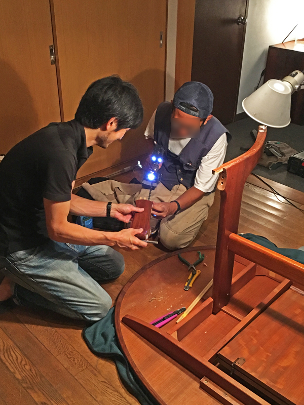 その後、そのお友達と工務店さんが3回も通って、この微妙なカーブをした鯨足のテーブルを再接着して治して下さったのです。