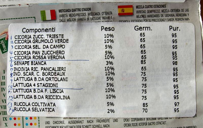 このイタリアFranchi社のサラダミックスを3年前から使い始めたのですが、それから我が家のサラダの世界がとても豊かになりました。 ここに書いてあるMisticanza(ミスティカンツァ)とは、サラダ用の柔らかい若い葉菜をミックスしたものの事で、このミックスにはチコリやレタス、それにハーブ、合計14種類の種が入っています。