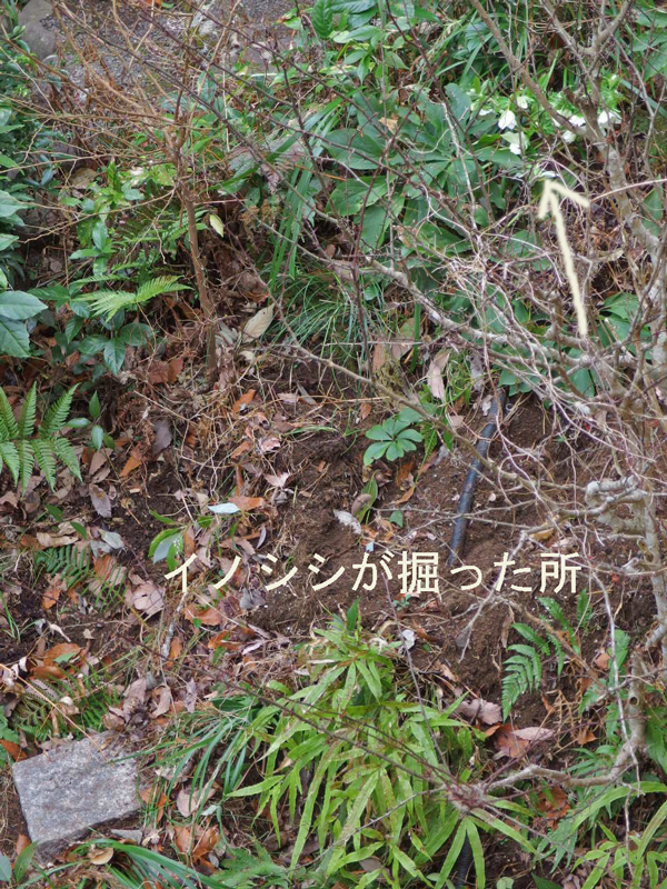 イノシシが掘り荒らした土手に、白く光っているものが目に入りました。