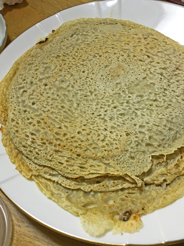 テフロン加工のフライパンではなくて、鉄のフライパンで焼きました。最初の1枚はくっつきやすいですが、毎回オイルをしませたキッチンペーパーで鍋底に薄く油をぬってから生地を流し、フチが乾いて剥がれてくるまで焼いてから返すと上手くゆきます。
