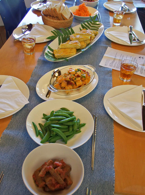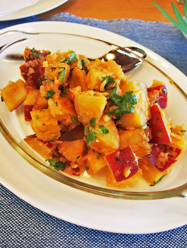 昨年秋収穫した自家菜園のさつま芋「鳴門金時」で作った、モロッコ風のさつま芋のサラダ。炒めた玉ねぎと蒸し煮してから、クミン、パプリカ、レモン、パクチーで合えてあります。
