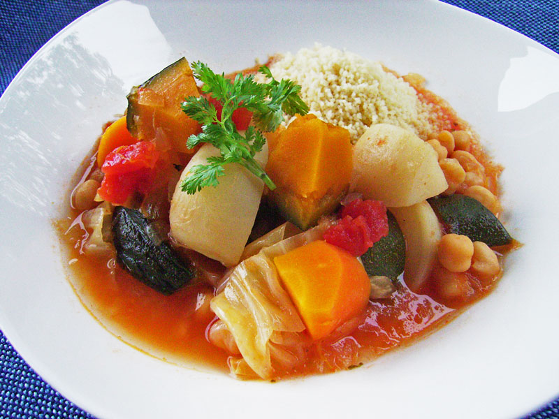 季節の野菜のスープ煮と一緒にいただきます。柔らかく煮込んだ、玉ねぎ、キャベツ、カボチャ、人参、カブ、ズッキーニ、トマト、野菜のエキスが溶けたスープ、それにクスクスが一体となってホッとする美味しさでした。