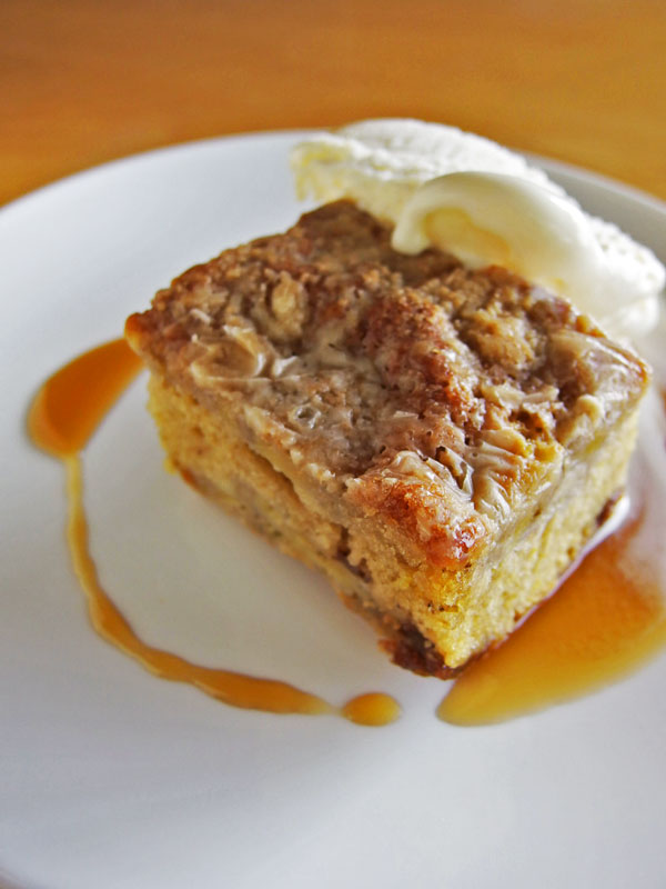 バナナのケーキ、卵も乳製品も使わない Vegan Banana Cake です。 アイスクリームとメイプルシロップ少々を添えました。