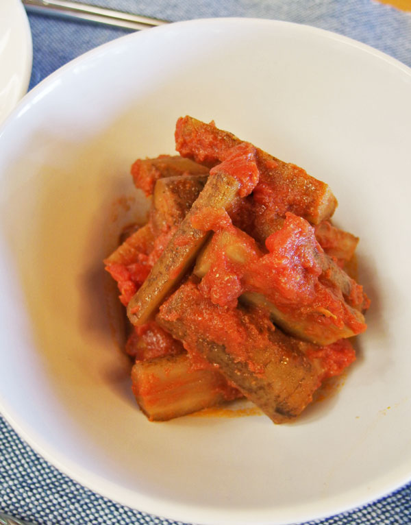 牛蒡のトマト煮、トマトと牛蒡は相性でワインにあう一皿です