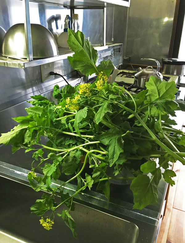 菜の花のような花、その下にはもう種が出来かけています。こんなに大きなった葉ですが、とても柔らかくて生でサクサクと食べられます。ピリッとした味が爽やかな素敵なサラダ野菜です。
