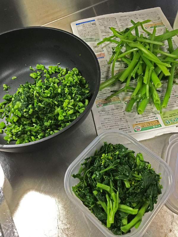 そして、柔らかそうな部分はお浸し用に、ちょっと固そうな部分は小さく切って塩炒りにしました。