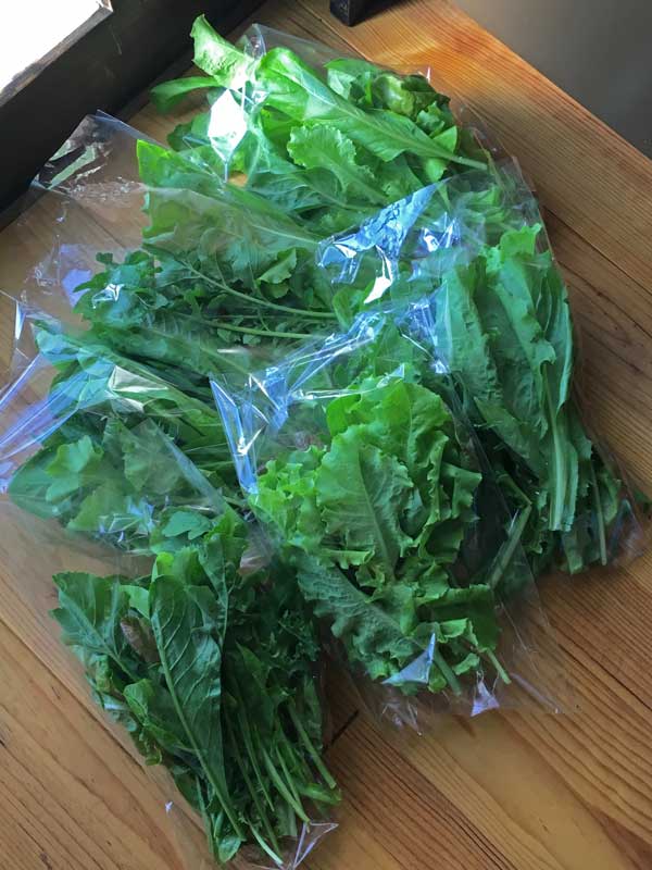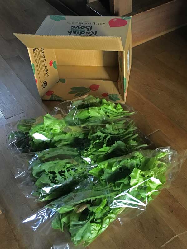 80×100センチほどのサラダミックスの畑から、もう40袋くらい収穫が出来ています。