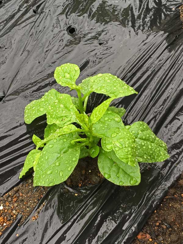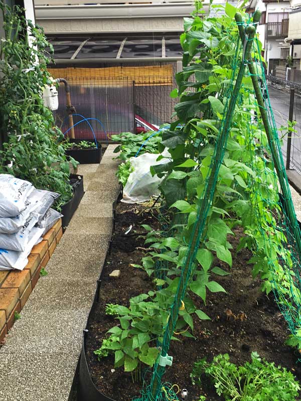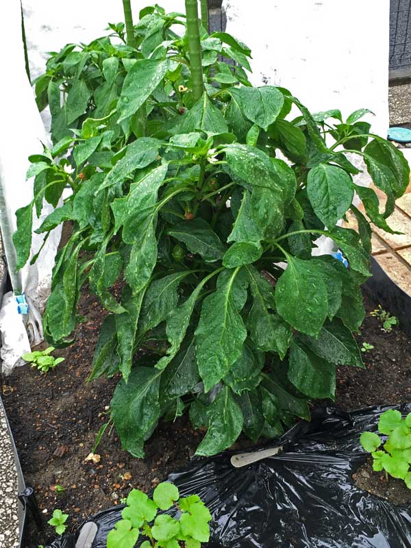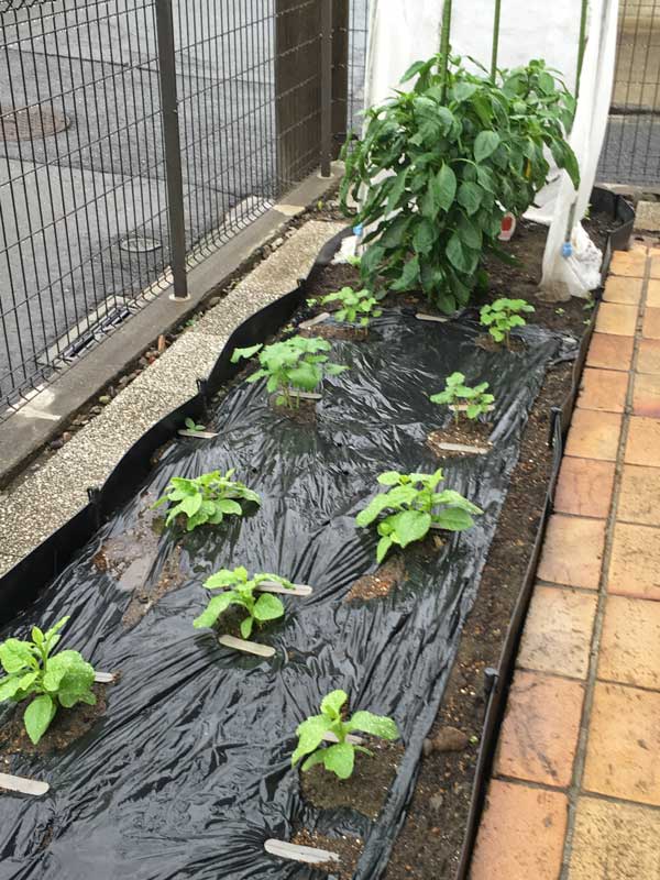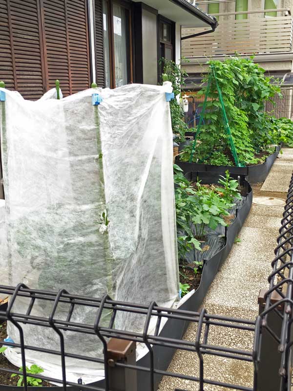 手前の不織布は風よけです。二方向が道路の角地で風あたりが強く、端に植えたパプリカの葉が縮れてきたので風よけをしたのです。