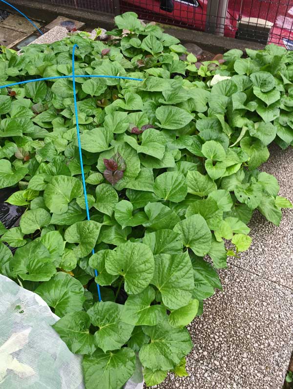 苗を植えてから寒い日が続き、苗が半分以上消えてしまいました。それで伊豆から芽の出たさつま芋を持って来て植え足したのですが、全部育って葉を茂らせています。