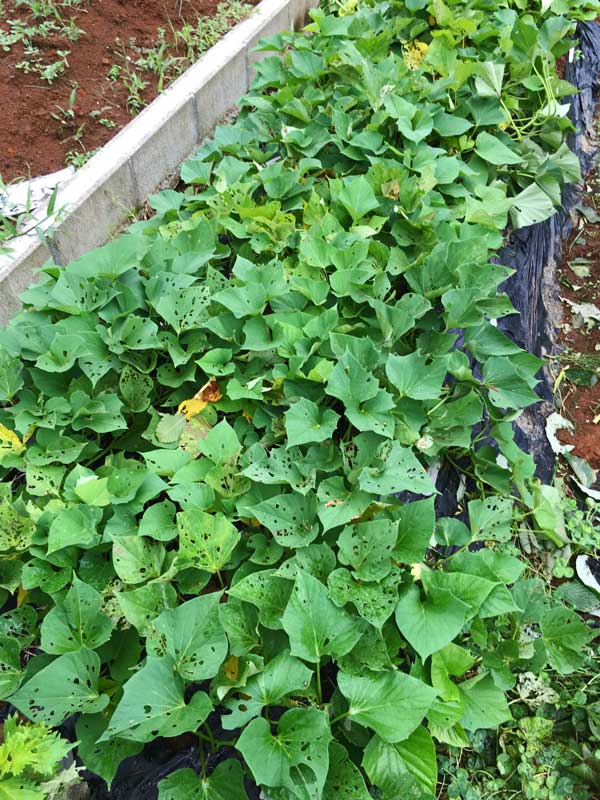 横浜のサカタのタネ本店で買ったサツマ芋。植えたのが早かったので最初寒さ除けの不織布をして育てたのですが、不織布を外したらバッタに葉を食べられてレースのようになってしまいました。