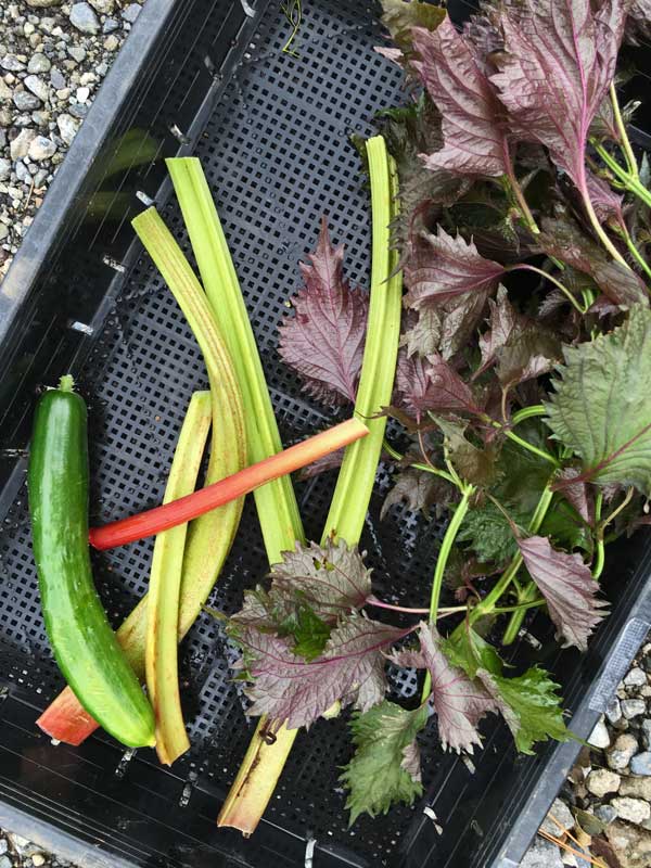 胡瓜1本、青紫蘇だったのに赤くなって来た紫蘇、それに風で折れたルバーブでした。