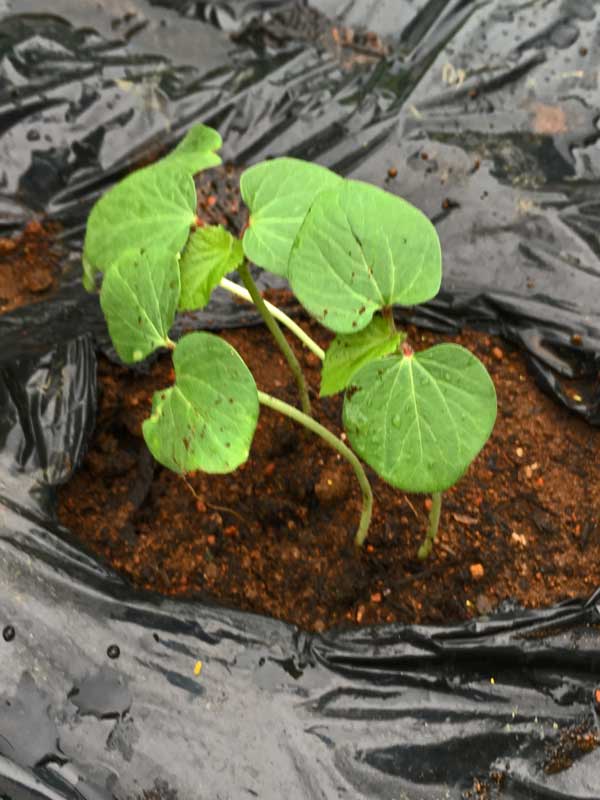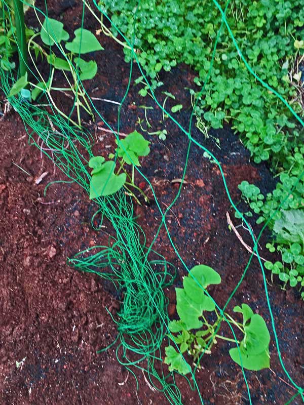 植え付けたツルムラサキの苗、横浜の家ではもう食べているツルムラサキと同じ時期に播いたものですが、ここ伊豆の山の方が気温が低いのか照射量が足りないのか、まだこの大きさです。
