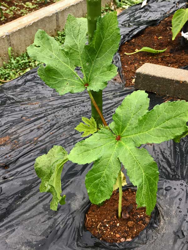 こちらの畑の斜めになったアーチも直し、倒れたフェンネルを元に戻して棒で止め、風で傷んだ葉をカットし、台風の後に植え付けようと思っていたツルムラサキ、オクラ、インゲンの苗を植え付けました。