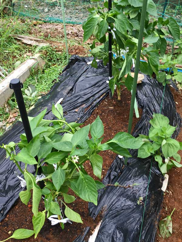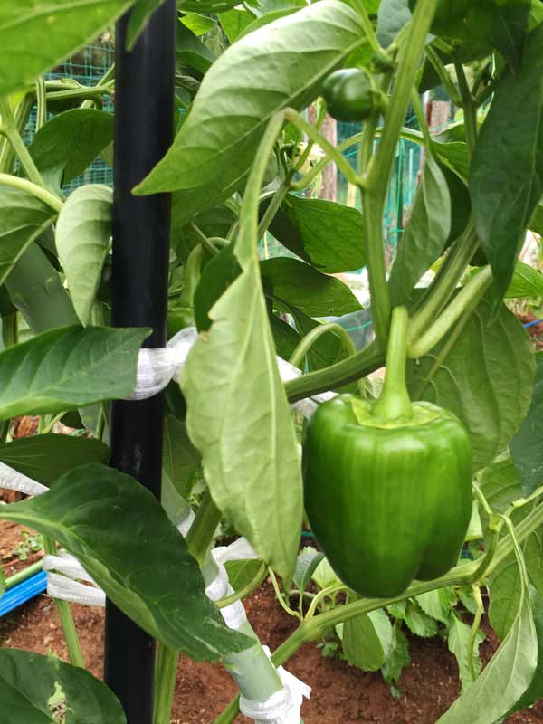 台風の前に支柱で補強したり、風よけで囲んだパプリカ。 風よけは吹き飛び、枝も何本かちぎれましたが、無事でした。