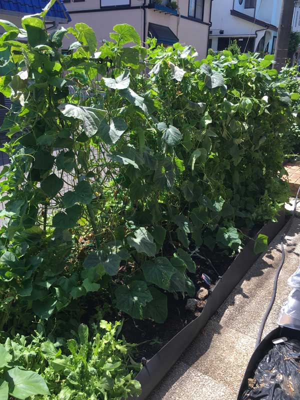 ↑ 重なったツルを外に伸ばし風通しを良くし、駄目になった葉を切って集めて捨て、大事に至る前に何とかなった胡瓜の棚。