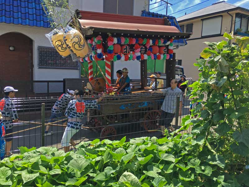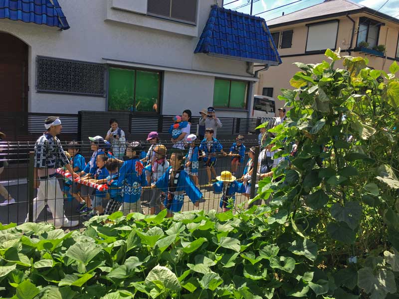 台所でお料理を作っていたら、にぎやかな音が聞こえてきました。戸を開けると子供たちがお祭りの山車を引いて歩いてきます☆