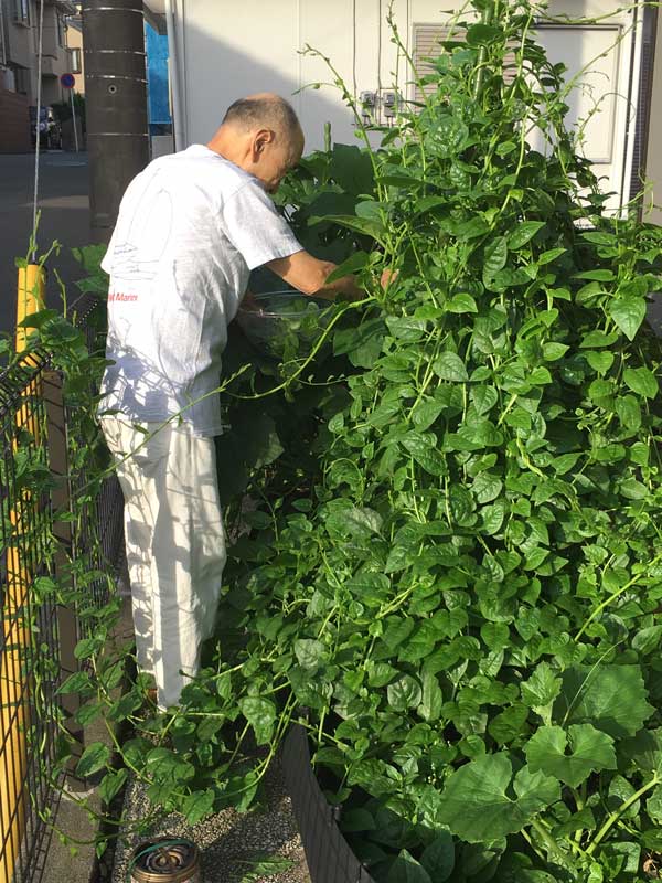 お客様にツルムラサキを使ったお料理を作るので、Mさんが一生懸命収穫しています。