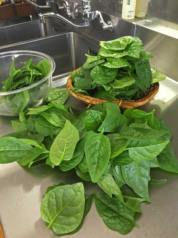 ツルムラサキを沢山使うお料理なので、この日に備えて2~3日収穫しないでいたのです。使うのは600グラム、Mさんは「葉は1枚約5グラムなので120枚」と言って、数えながら採っています。大きい葉は1枚5グラムほどですが、中くらいの、小さいの、色々なので、Mさんが採った葉を、私がスケールで量る事にしました。
