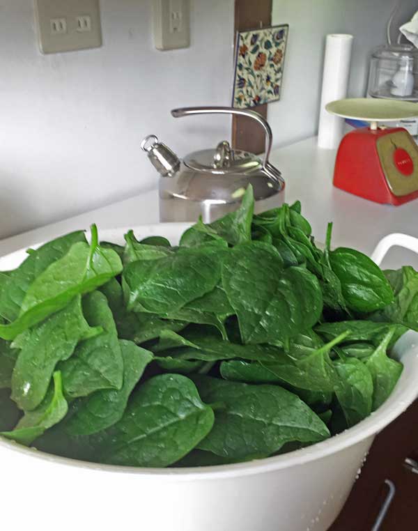 入れた容器は洗濯用の洗い桶、600グラムのツルムラサキは相当な量です。