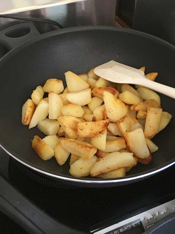 茹でてからソテーしたじゃが芋を、スパイスで炒め合わせるのです。作るのはインドのベジタリアン料理 ALOO SAK ・Spinach with Potatoes 、「インド菜食料理の芸術」という本で見つけた料理です。