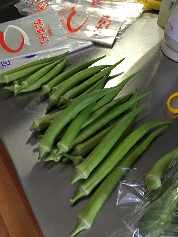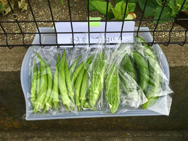 この日の野菜は、オクラ、ゴーヤ、胡瓜です。何とかご近所さんのゴミ出し時間に間に合いました。Mさんと「もらって頂けるしら?」とドキドキしていたのですが、30分後には全部なくなっていました。