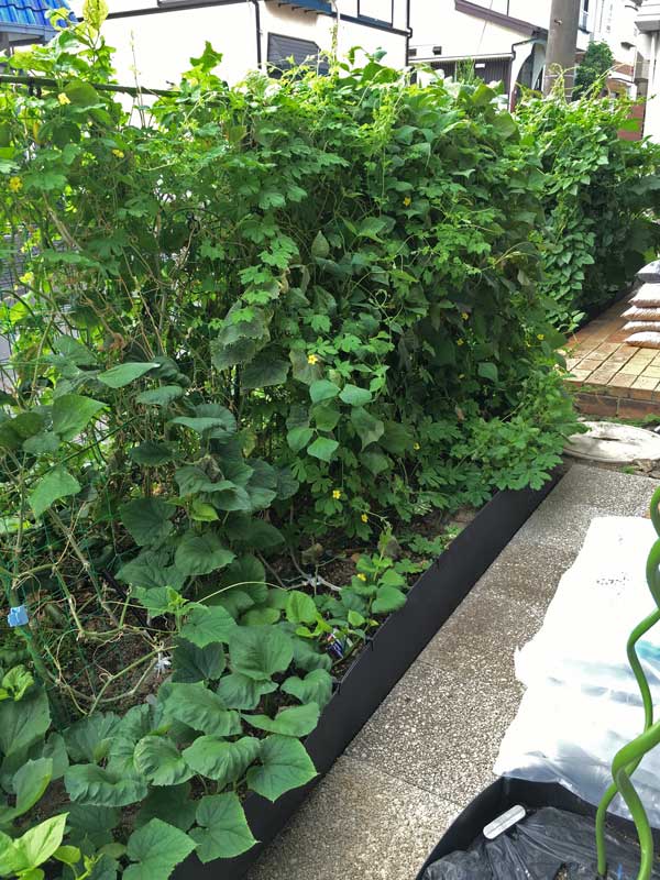 この春大急ぎで庭に作った小さな畑、野菜が成長して今はこんな風になりました。