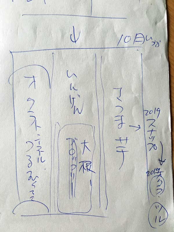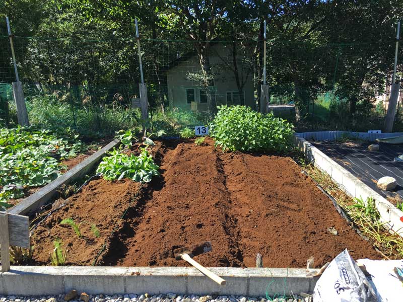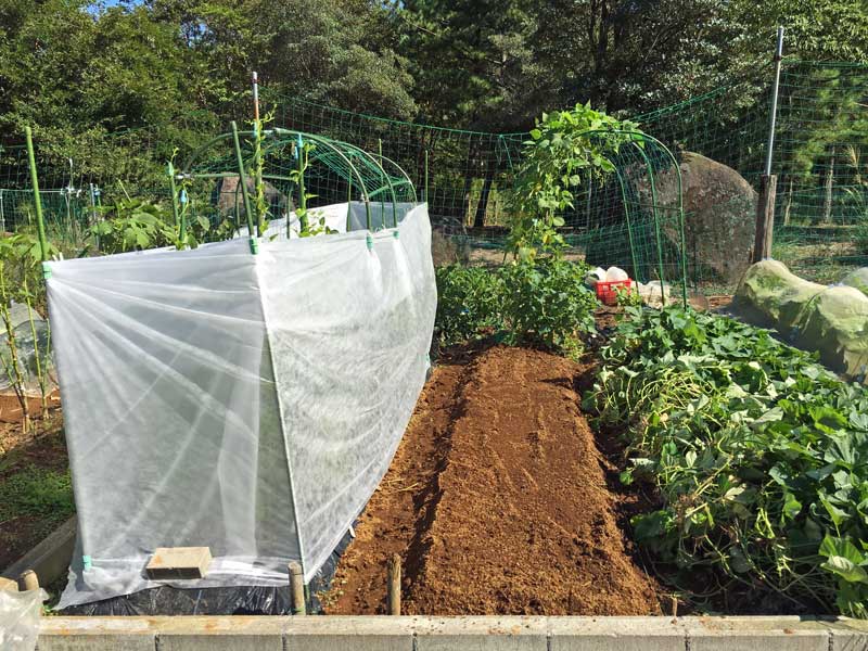 ツルムラサキとオクラは不織布で覆って温度を上げ、10月いっぱい収穫出来ないか試してみる事にしました。10月にサツマ芋を収穫した後、11月そこにスナップエンドウを植え、来春スナップエンドウが終わった後に、オクラとツルムラサキを植えます。今が播き時の大根は、真ん中の空いているスペースになります。
