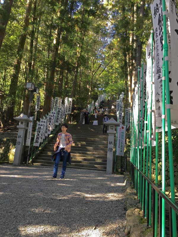 最初に訪れた熊野本宮大社、急な石段は158段。早朝のフライトで疲れ気味のMさんに、「私一人で上まで登ってMさんの分までお祈りして来るから」と説き伏せて、一人本殿へ。後で尋ねるとMさんは、途中までゆっくり登って、Uターンして、下の川のほとりにある旧本殿後でお祈りをしたとの事。