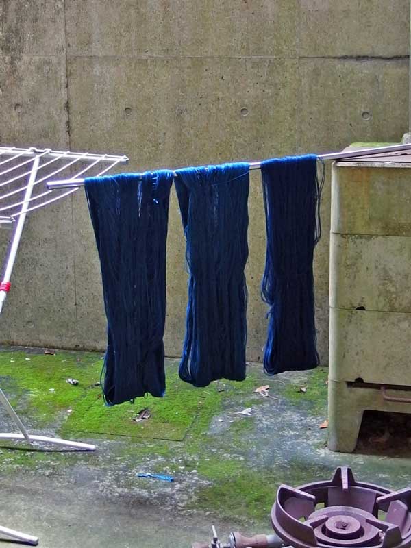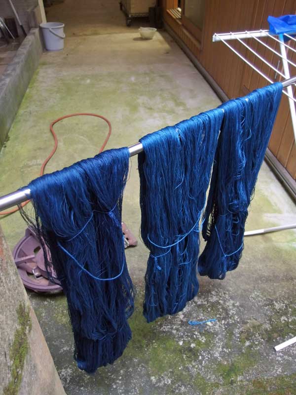 染まった糸はよく洗ってから乾燥させ、次に糊付けして、それから使います。長い織物の作業の一つのステップが無事終わりました。