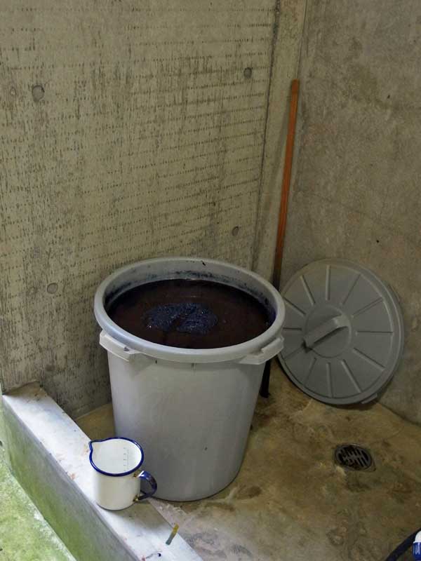 仕事場の片隅にある、藍染液の入ったポリ容器。
