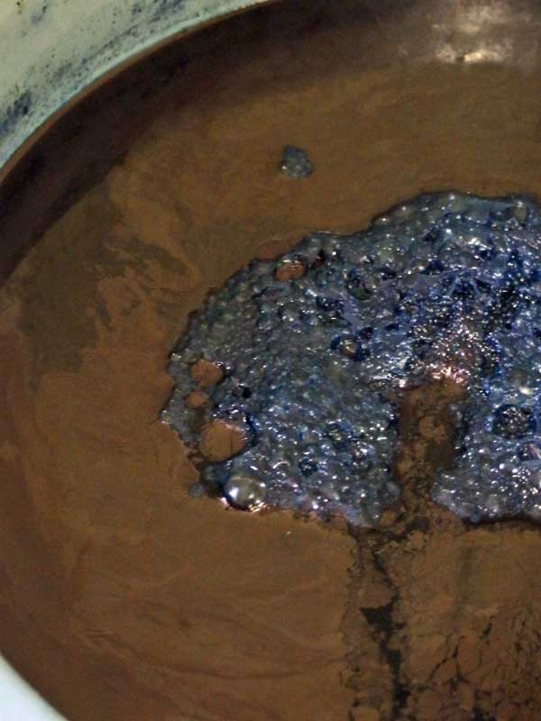 液は、中は茶色ですが、空気に触れている表面は藍が酸化して藍色の薄い膜がはり、かき混ぜるとそれが集まって泡のようになります。