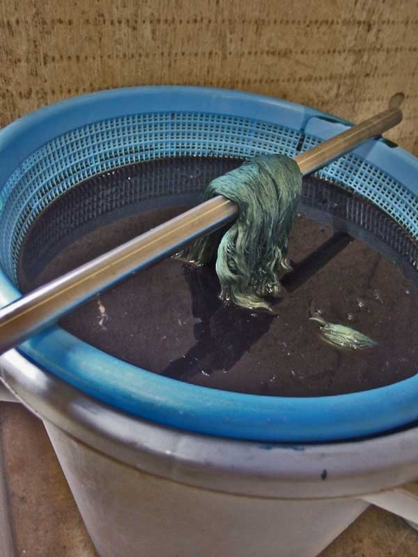 糸をそっと藍液の中に入れて、2~3分浸してから、引き上げると・・・ 空気に触れて茶から緑になってゆきます。 そして一気に固く絞り、はたいて空気に触れさせると・・・ 糸は藍色になります。
